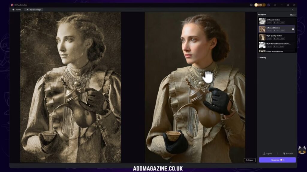 Focusing on restoring historical photos, MyHeritage has made an AI tool that specialises in AI photo restoration. For those wanting to restore the details on someone’s face or add colour to a black-and-white photo, this tool serves the purpose.
