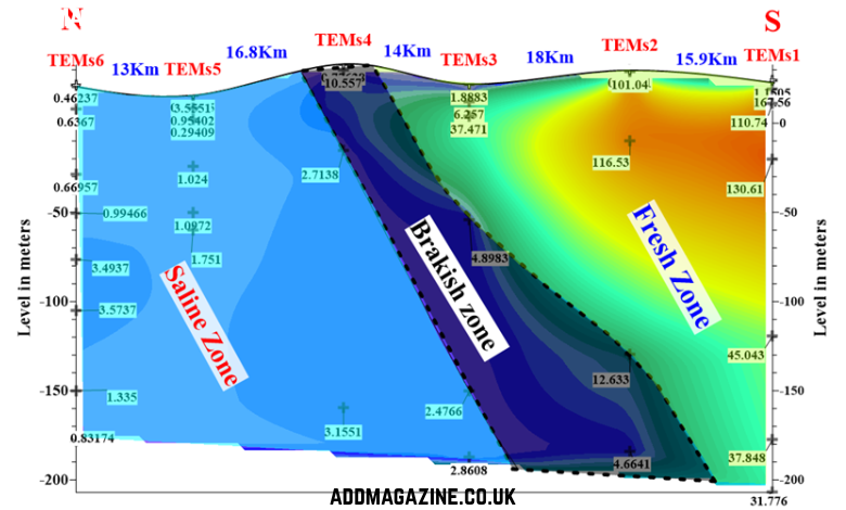Geophysical surveys across the world — in Pakistan, Egypt, and the Gulf region — have mapped these stratified boundaries both at the surface and deep underground, in coastal aquifers where freshwater and saltwater coexist withoutcrossing each other. Look of section below describing 80Km from near Alexandria city to south Tanta showing fresh, brackish and saline water interface each other , the brackish exist in the salinity stratification zone (halocline)